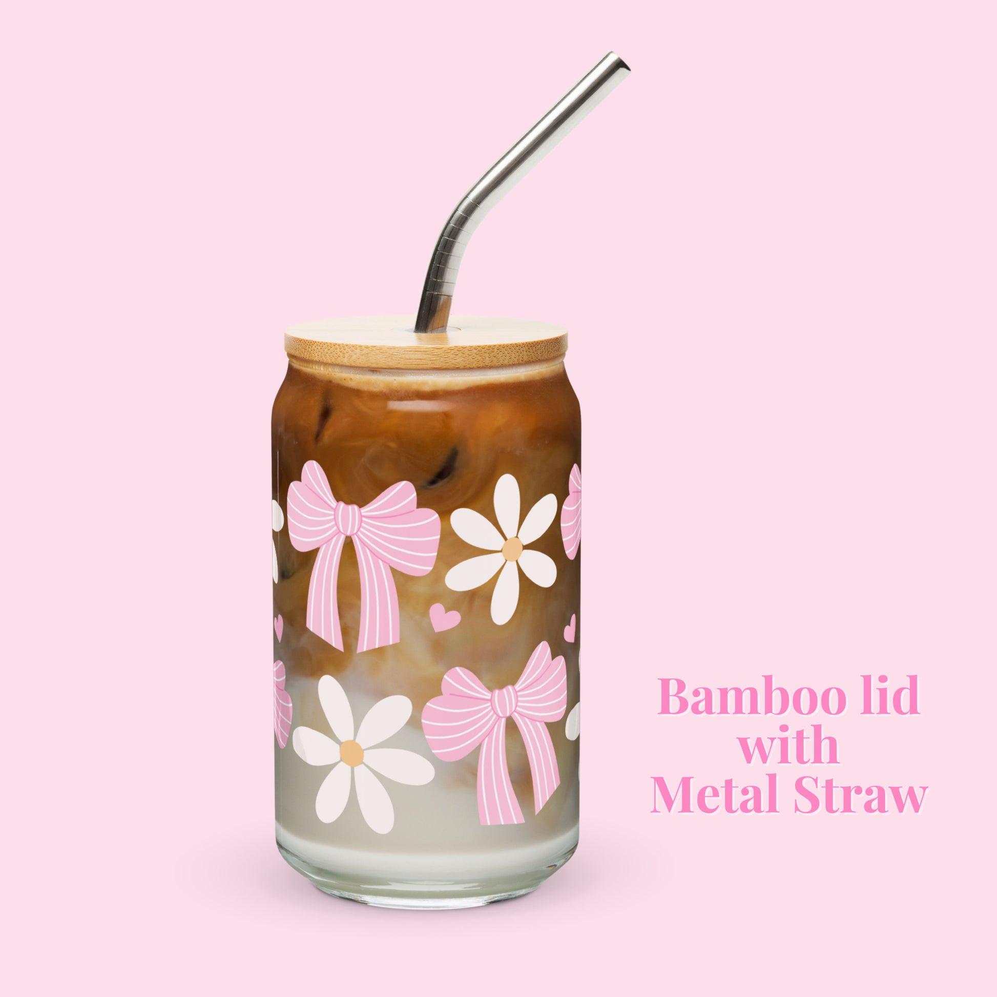 Whether you enjoy drinking iced coffees, cold drinks or summer cocktails. Make it super cute and aesthetic with our bow and daisy pattern glass tumbler.
