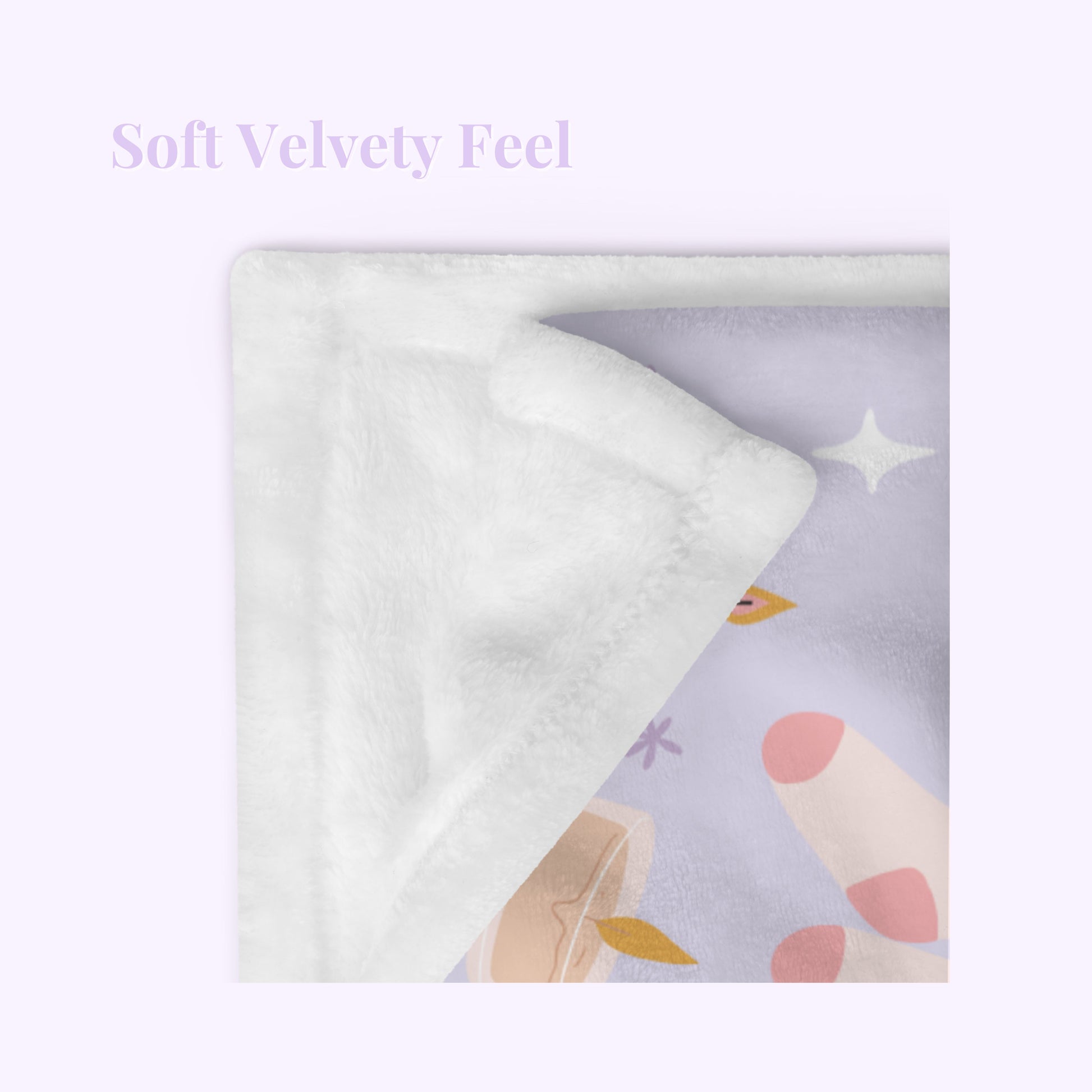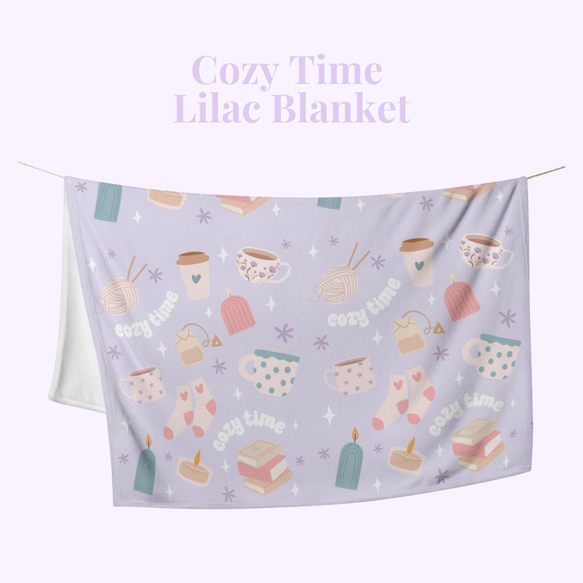 Get cozy with our cute cozy time blanket. It's super soft and silky in a lovely pastel lilac colour with all our favourite cozy things. Candles, cups of tea, mugs of coffee, knitting, books and woolly socks! It’s soft velvety feel is perfect for the colder nights too.