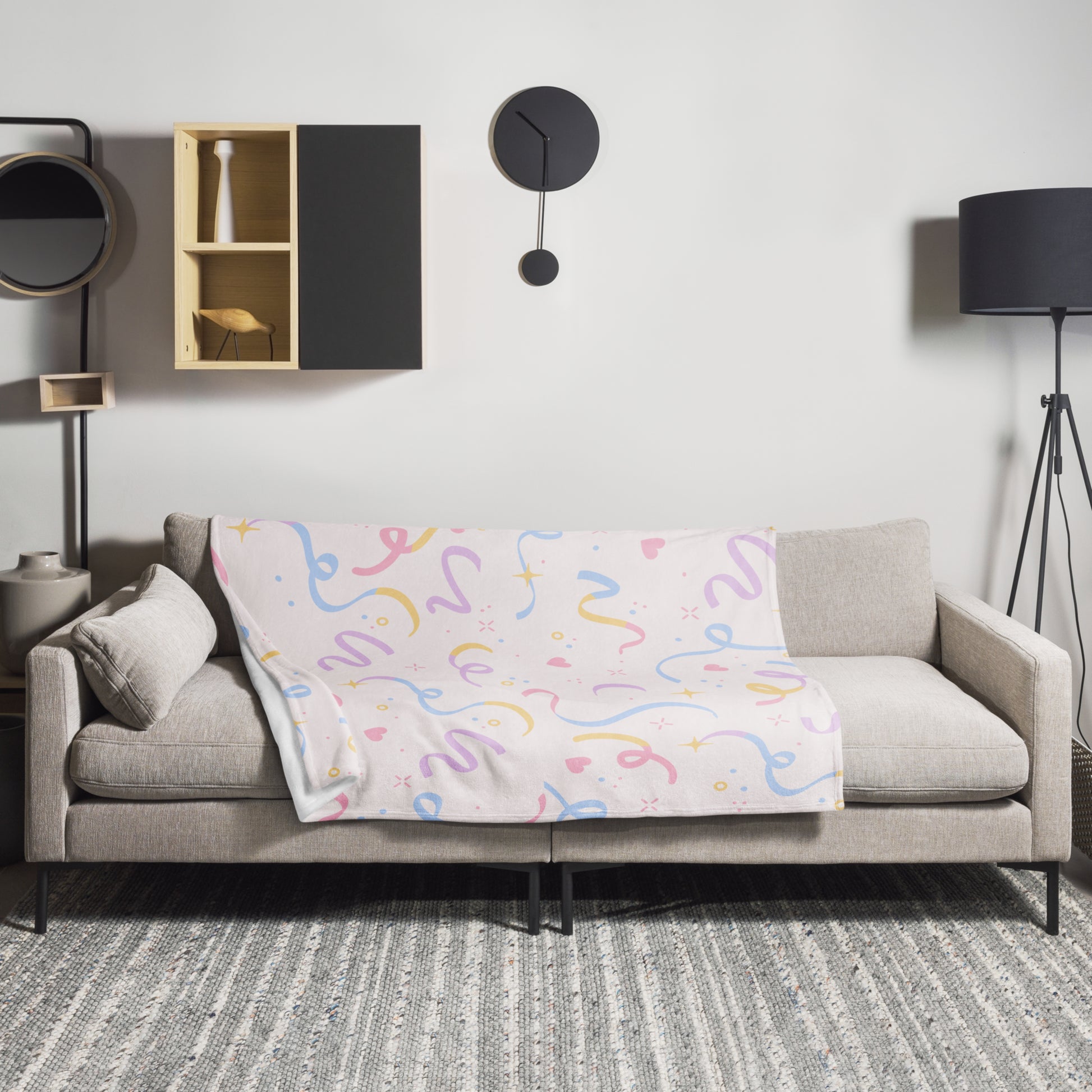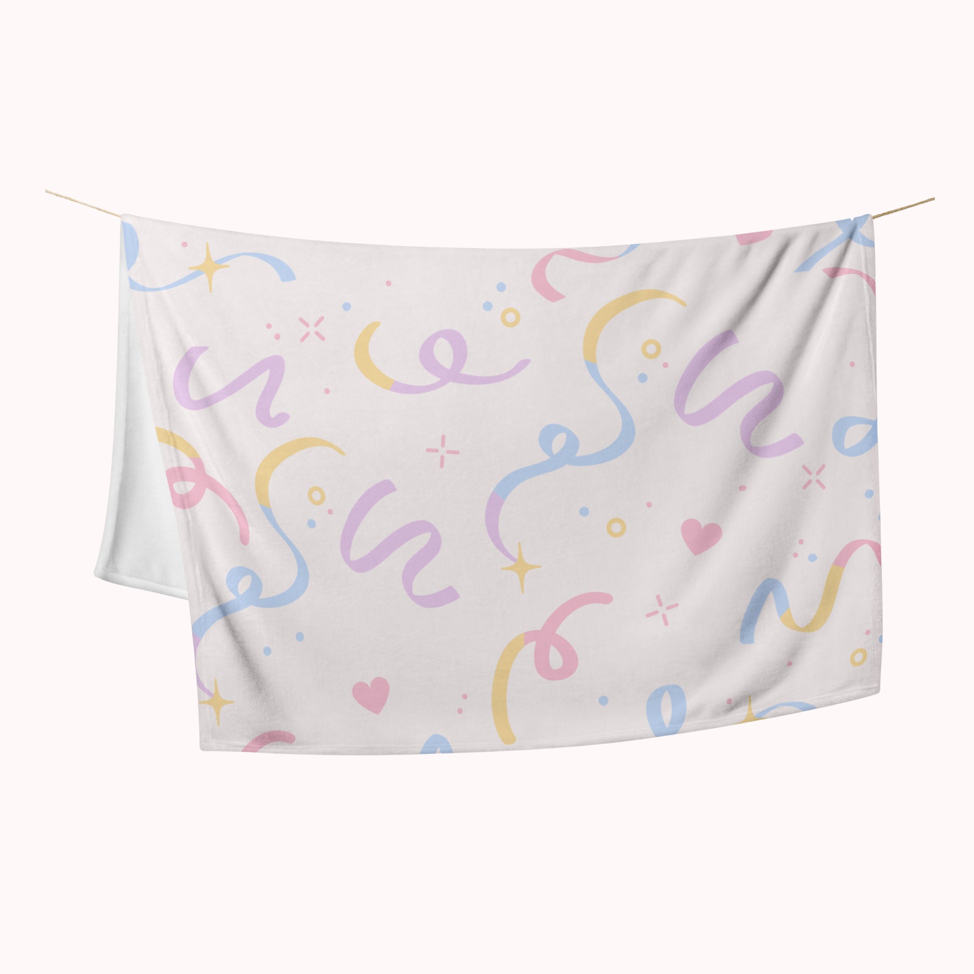 A soft silk touch throw blanket that's ideal for lounging on the couch during chilly evenings. A lovely soft cream colour with pastel swirls and hearts makes it a clean and cozy addition to any home.