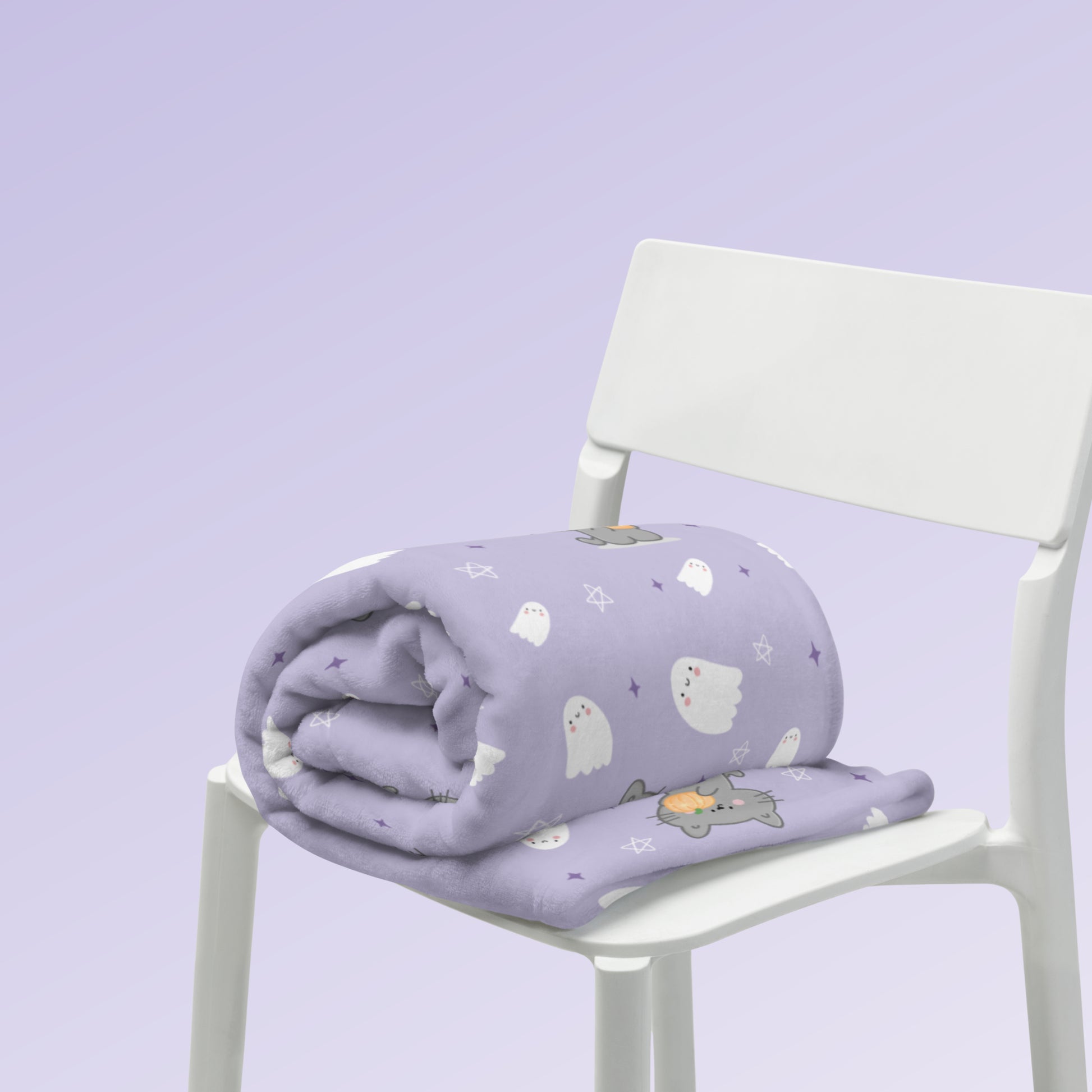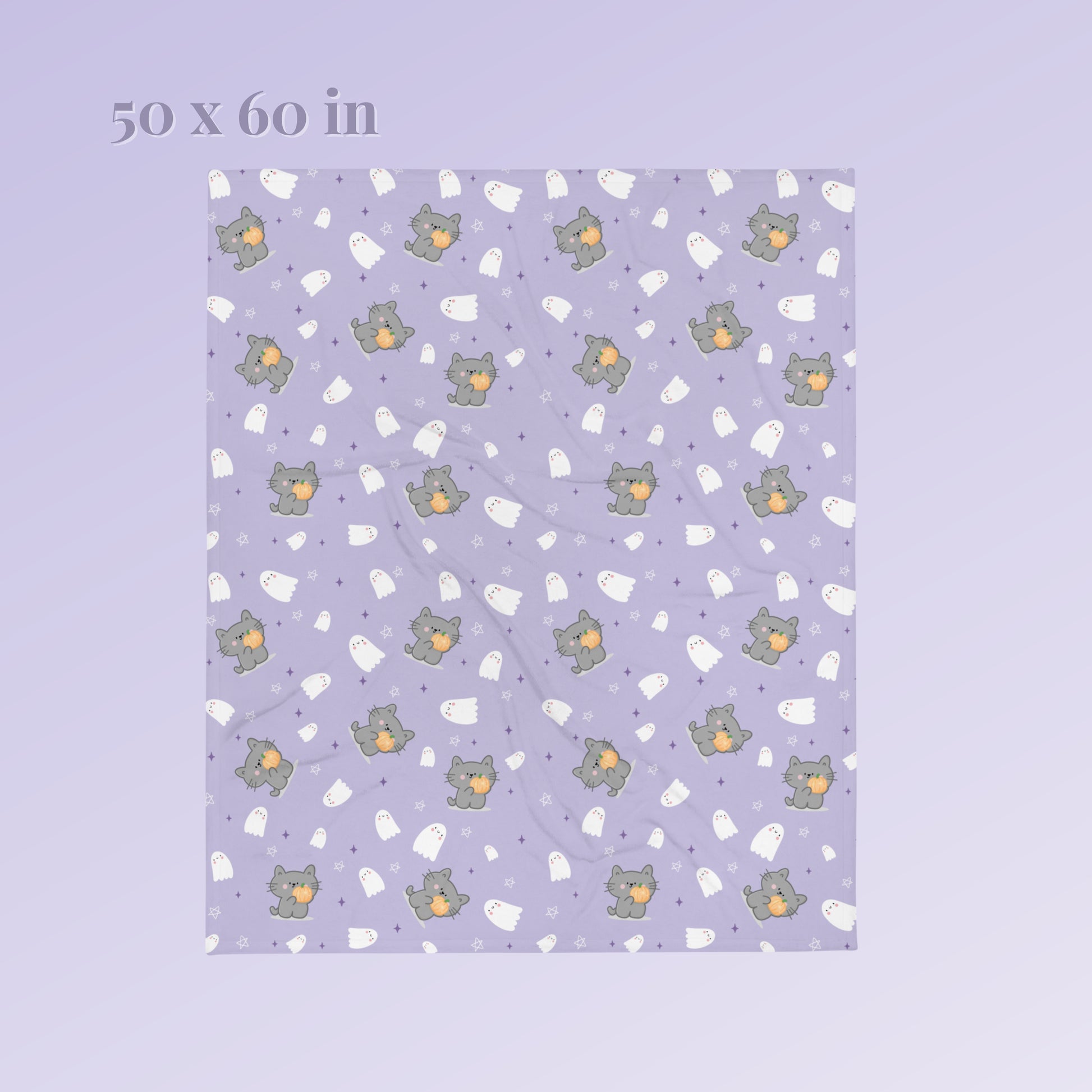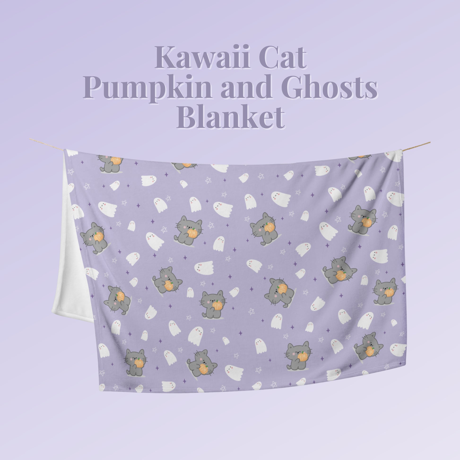 Cute kawaii cat, pumpkin and ghosts. This cozy purple blanket with a spooky season pattern is velvety soft. That's ideal for lounging on the couch during chilly evenings.